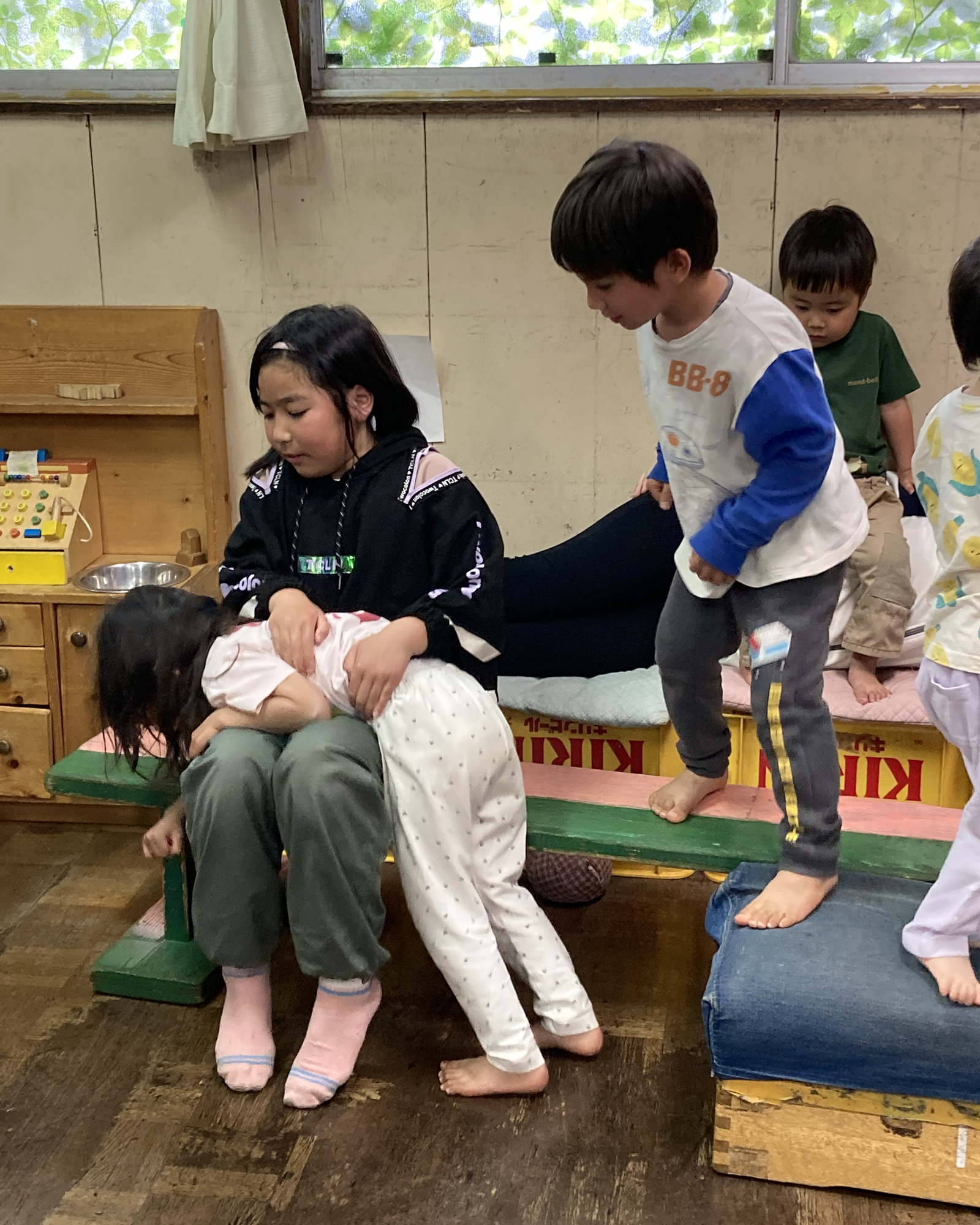 「げんこつ組」は、その母体となった無認可保育園「はちのこ保育園」と同じ敷地内にあります。そのため、異年齢の子どもたちといつも交じって遊んでいます。